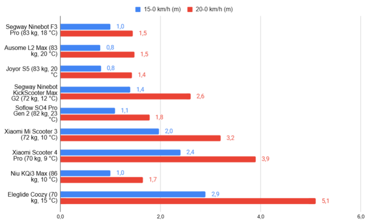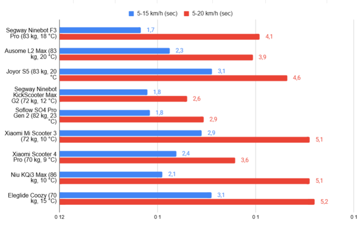 Für die letzten zwei bis drei km/h bis zur Unterstützungsgrenze bei 20 km/h nimmt sich der Segway-Scooter relativ viel Zeit. Das wird auch bei unseren Vergleichsmessungen deutlich. Von 5-15 km/h ist der F3 Pro an der Spitze des Feldes. Die gemittelte Zeit von 5 auf 20 km/h ist hingegen nicht mehr top.