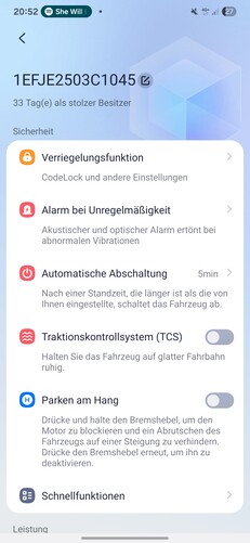 Entsperren lässt sich der Roller über die Eingabe eines Musters auf dem Multi-Bedienpanel oder durch ein gekoppeltes Smartphone in Bluetoothreichweite (AirLock) - die erforderliche Nähe kann in der App eingestellt werden. Das funktioniert im Test problemlos, der Start gelingt mit dem richtigen Smartphone in der Tasche ohne Verzögerung.