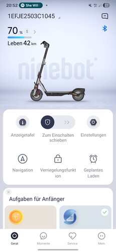 Die Segway-Mobility-App ist die Schaltzentrale für den Ninebot F3 Pro. In der App werden Fahrdaten angezeigt - auch Live. Über die Software lassen sich aber auch viele Einstellungen tätigen und Updates installieren. Davon gibt es im Testzeitraum mehrere für Akku, Motor und Steuereinheit.