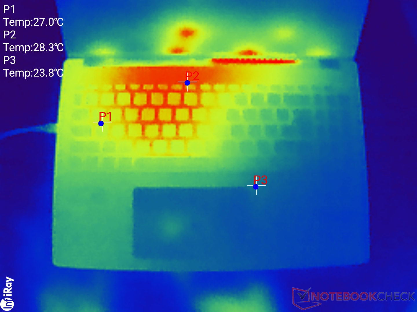 (+) Die Handballen und der Touchpad-Bereich sind mit gemessenen 27.1 °C kühler als die typische Hauttemperatur und fühlen sich dadurch kühl an.