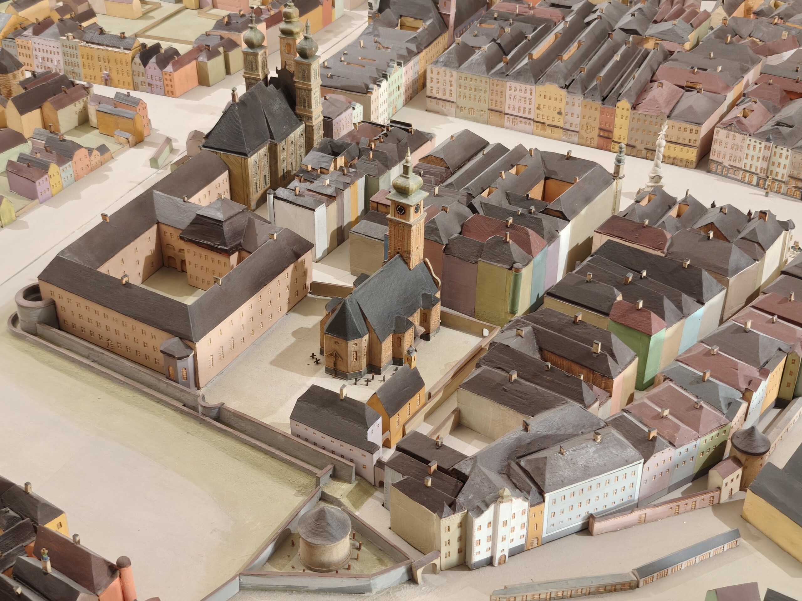 Von hier oben hat man einen tollen Blick auf die Stadt mit ihren barocken Kirchtürmen und den dampfenden Kaminen der Fabriken in der Ferne.