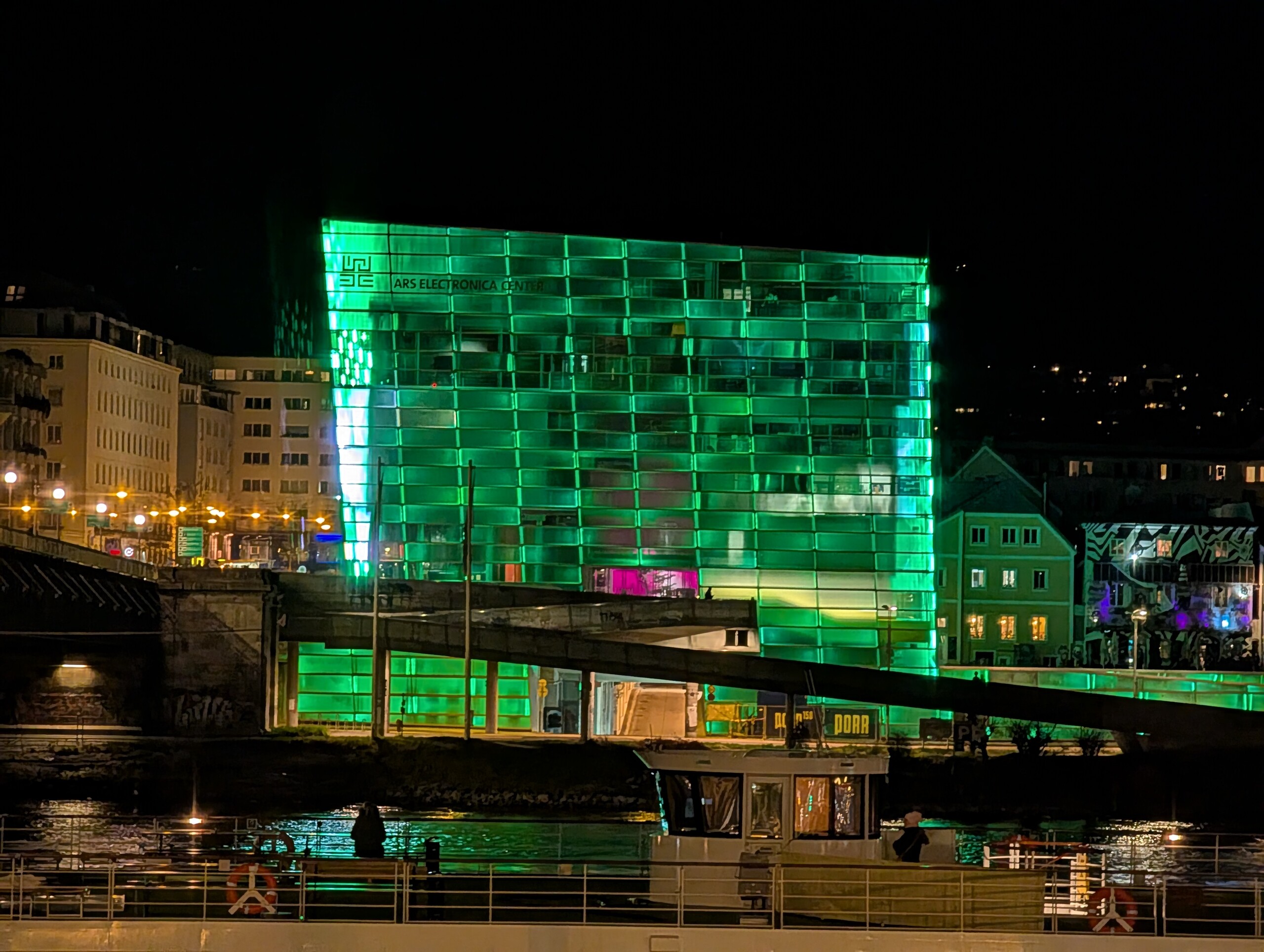 Die Donau als große Wasserstraße und Naherholungsgebiet prägt die Stadt bis heute. Wir wandern von der Innenstadt aus donauabwärts Richtung Hafen. Dort soll sich nämlich ein ganz besonderes Highlight für Streetart-Fans befinden. Zunächst aber passieren wir das Brucknerhaus, eine Konzerthalle, die nach dem weltberühmten Komponisten Anton Bruckner benannt ist, welcher in der Nähe von Linz geboren wurde und hier auch zeitweise arbeitete.