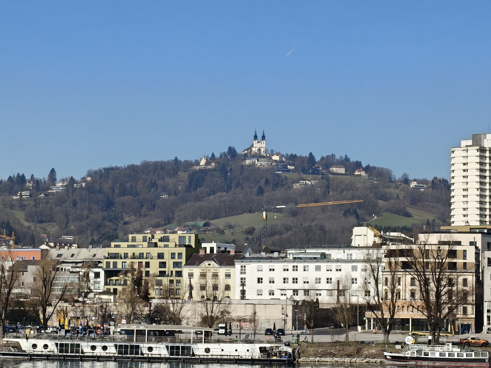 Blickt man von der Altstadt aus über die Donau auf die andere Flussseite, so beherrscht der 539 Meter hohe Pöstlingberg die Szenerie. Auf seiner Spitze steht eine Wallfahrtskirche aus dem 18. Jahrhundert. Wir werden ihn später auch noch besuchen, erstmal wollen wir aber die Zoomfertigkeiten unserer beiden Kontrahenten an dieser Szenerie erproben.