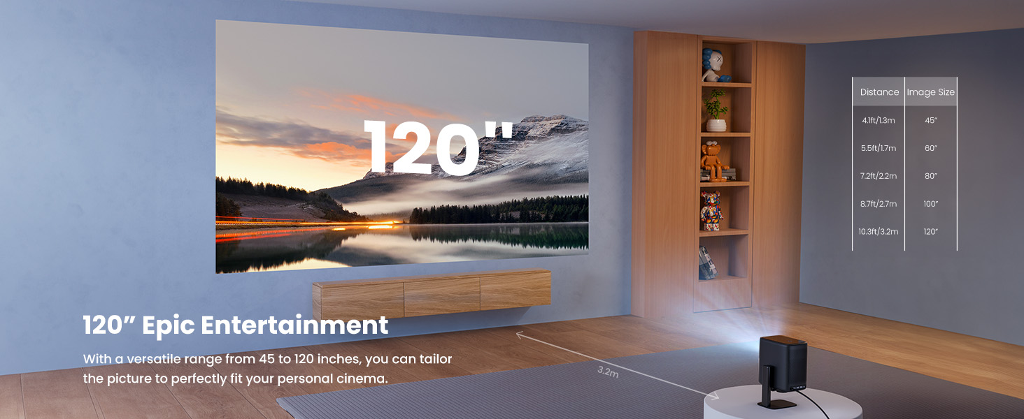 Es handelt sich um einen kompakten Beamer mit LED-Lichtquelle. Das hat Vorteile eben in der Größe, aber auch in Bezug auf die Leistungsaufnahme, zudem sind solche LED-Beamer häufig auch besonders leise. Ein Problem gerade im günstigen Preisbereich: Die Helligkeit ist insbesondere im Vergleich zu Beamern mit konventioneller Lichtquelle - also einer Lampe - gering. Der Dangbei N2 ist diesbezüglich keine Ausnahme, so wird die Helligkeit mit 400 ISO-Lumen angegeben - dabei handelt es sich eben nicht um ANSI-Lumen. Es kann ein bis zu 120 Zoll großes Bild projiziert werden, dann beträgt der Abstand zwischen Beamer und Leinwand 3,2 Meter.