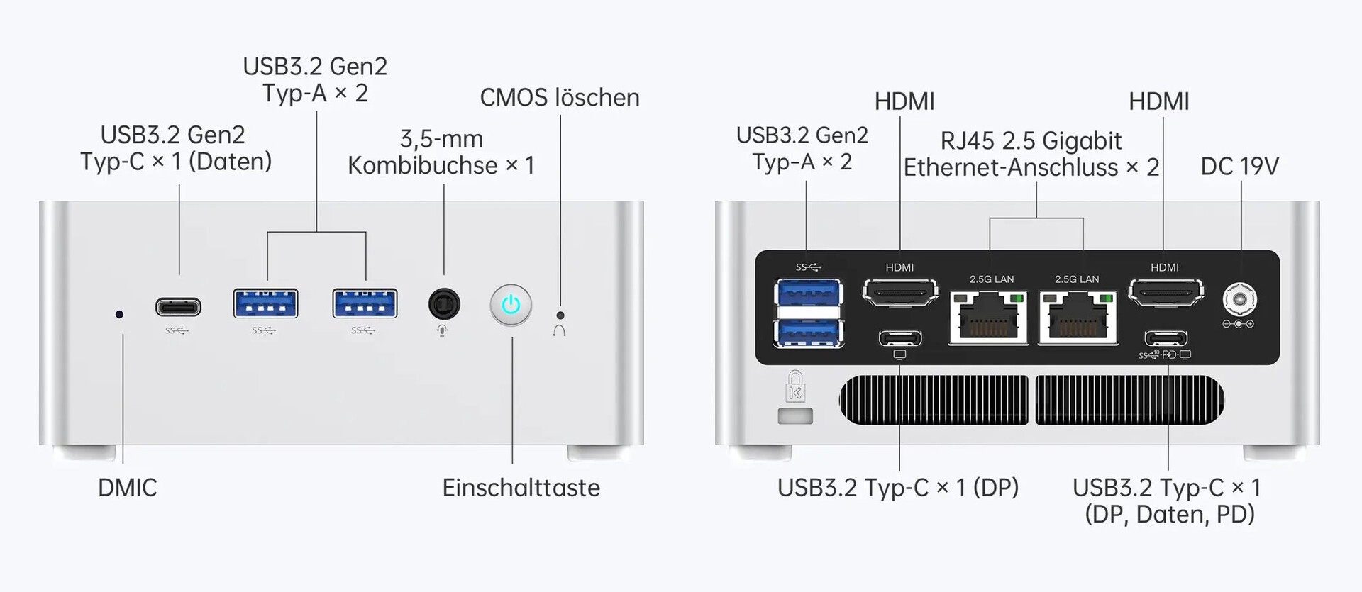 Die beiden Slots für den Arbeitsspeicher können einen bis zu 64 Gigabyte großen DDR4-Arbeitsspeicher aufnehmen. Es ist nicht nur eine über PCIe 4.0 anzuschließende M.2 2280-SSD nutzbar, stattdessen ist auch die Montage eines 2,5-Zoll-Laufwerks möglich. Die obere Abdeckung des PCs soll sich über einen einfachen Druck auf die Abdeckung abnehmen lassen.