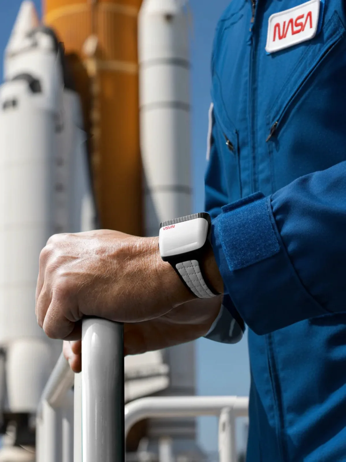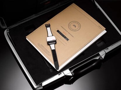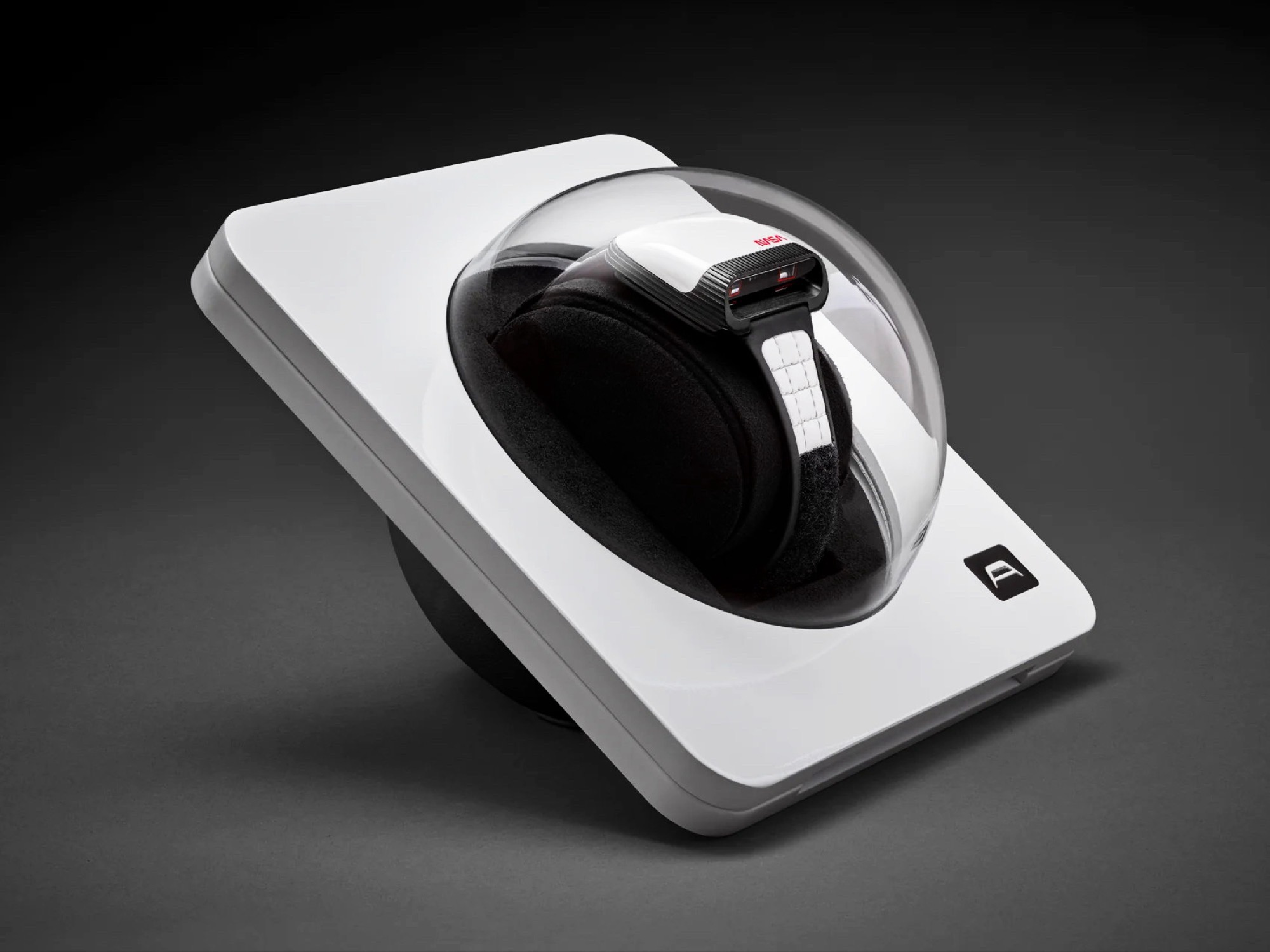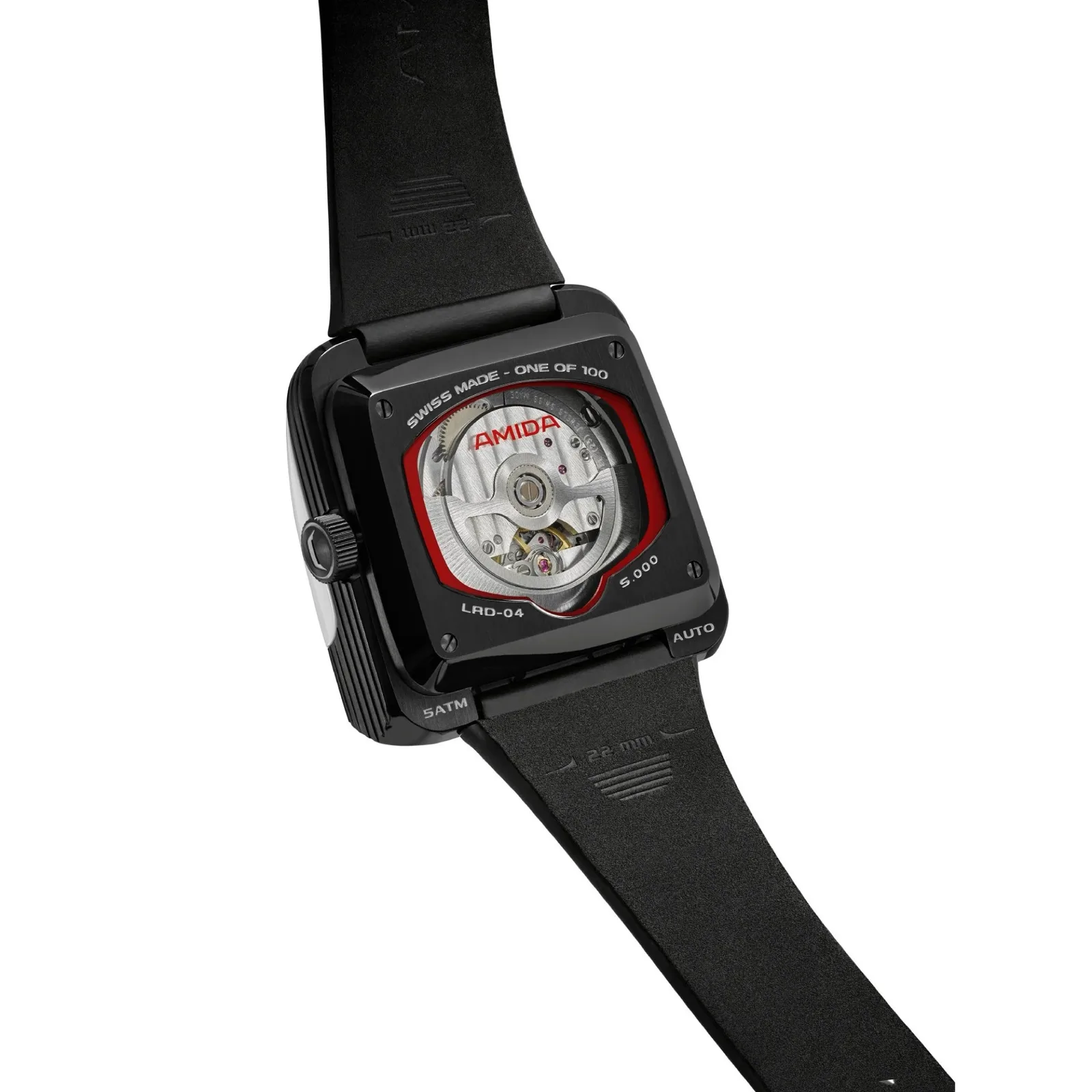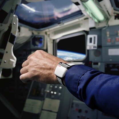 Das Armband kombiniert weißes Leder mit einem Klettverschluss, wie er auch von Astronauten eingesetzt wurde, wodurch die Länge des Armbands stufenlos verstellt werden kann. Die Rückseite besteht aus Edelstahl und gewährt einen Blick auf das Soprod Newton P092 Uhrwerk, das mit 23 Rubinen ausgeführt wird, und das nur alle 44 Stunden aufgezogen werden muss. Das fast quadratische Gehäuse weist eine Kantenlänge von 39 Millimetern und eine Bauhöhe von 15,6 Millimetern bei einem Gewicht von 90 Gramm auf.