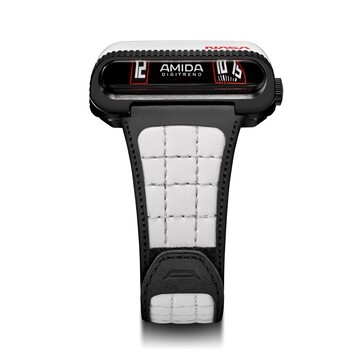 Bei der Amida Digitrend NASA Tribute Limited Edition handelt es sich um eine Neuauflage der Amida Digitrend aus dem Jahr 1976, allerdings weist die neue, in der Schweiz hergestellte Uhr ein grundlegend überarbeitetes Design auf. Das weiß glänzende Keramik-Gehäuse mit rotem NASA-Logo und die kugelförmige, transparente Kunststoff-Verpackung sind Anspielungen an die Raumfähren des Apollo-Programms.