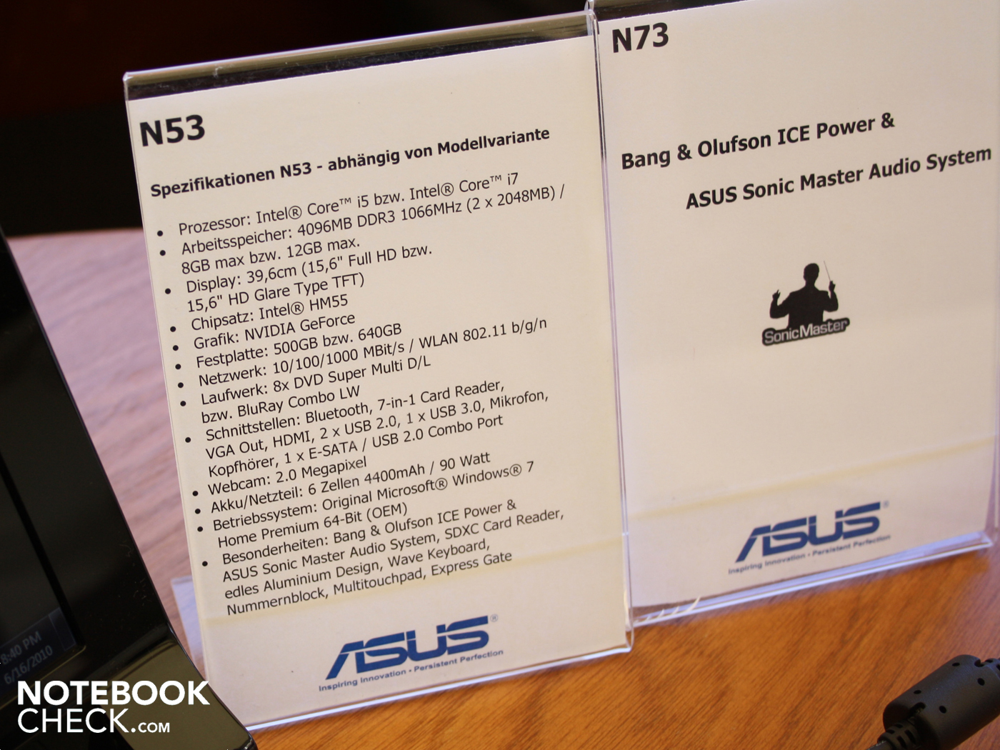Bereits auf der CeBIT 2010 hatte Asus sein akustisches Flaggschiff NX90 vorgestellt. Der 18.4-Zoller ist die Avantgarde der N-Serie, welche von 14-Zoll (N43) über 15.6-Zoll (N53) bis 17.3-Zoll (N73) reicht. Alle mit SonicMaster gekennzeichneten Geräte besitzen eine laut Asus erstklassige Soundaustattung mit einem 11 Watt Verstärker (üblich drei Watt). Die Größe der Membranen ist je nach Formfaktor unterschiedlich.