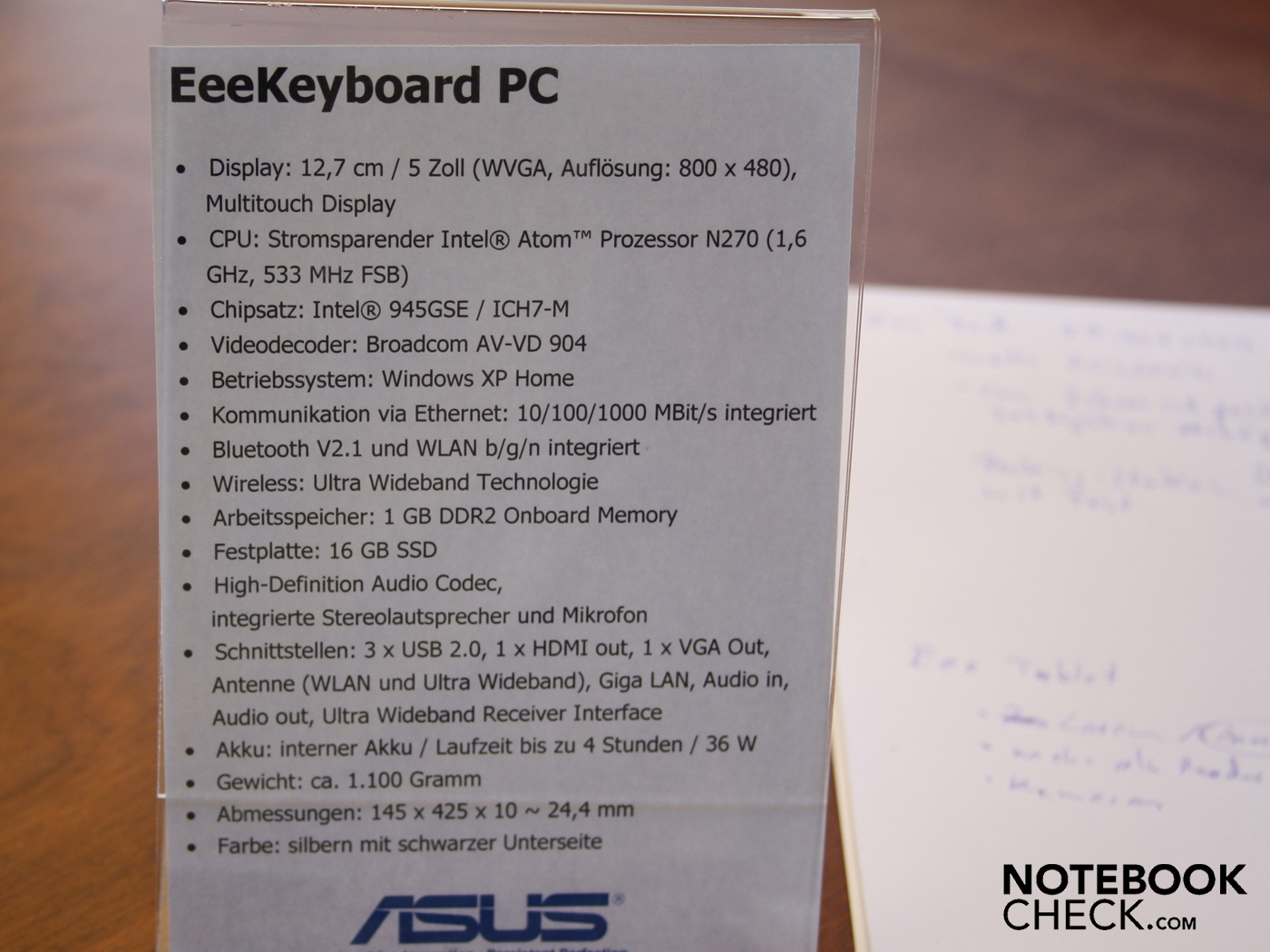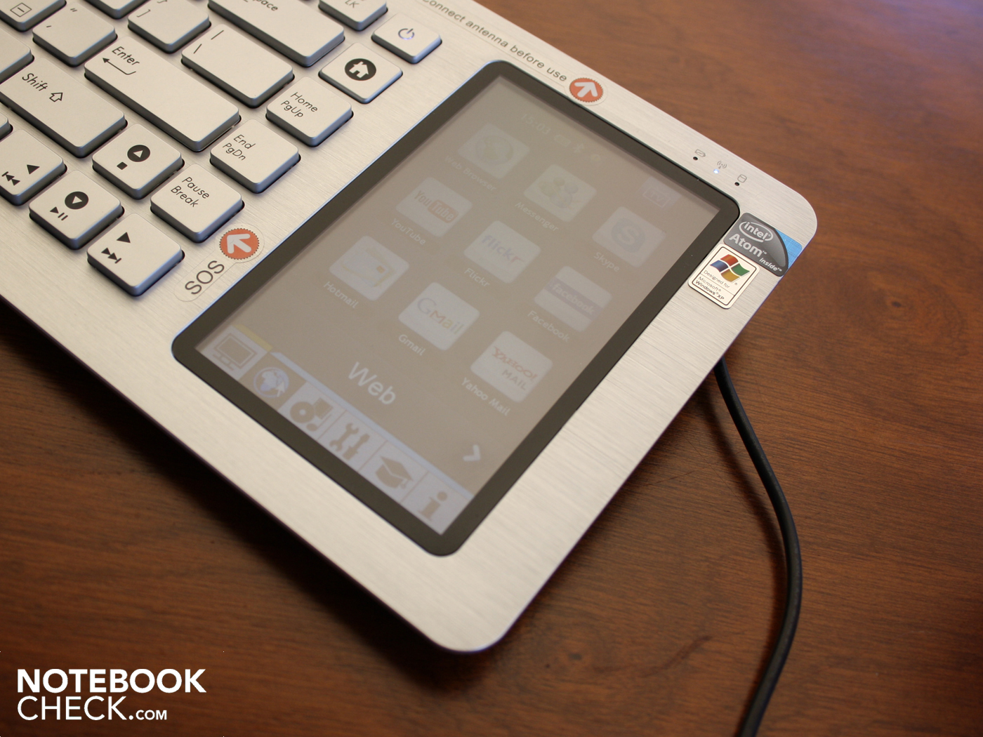 Das integrierte Multitouch Display soll eine intuitive Bedienung ermöglichen. Sämtliche Programme wie der Media Player oder Webchats sind darüber schnell aufgerufen. Der Eee Keyboard PC arbeitet mit Windows XP Home und Intel Atom N270 Prozessor. Die Plattform entspricht also der ersten Netbook-Generation und ist daher veraltet. Als Speicher kommt keine HDD, sondern ein schockresistenter 16 GB SSD Speicher zum Einsatz.