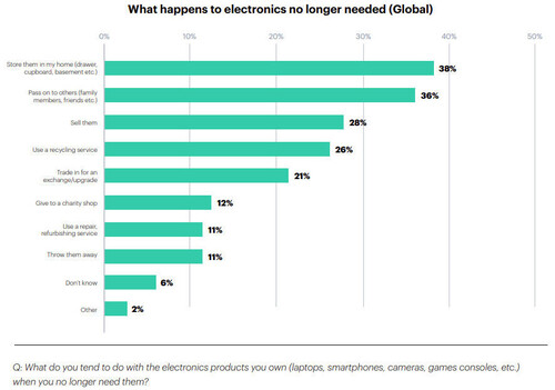 38 Prozent in allen 18 untersuchten Märkten geben an, üblicherweise elektronische Geräte, wie Laptops, Handys, Kameras etc., die sie nicht mehr benötigen, in ihrem Zuhause aufzubewahren, beispielsweise im Schrank oder im Keller. 36 Prozent geben diese an andere Personen weiter, 28 Prozent verkaufen sie, 26 Prozent nutzen einen Recyclingdienst. Dass sie sie wegwerfen, sagen 11 Prozent aller Befragten.