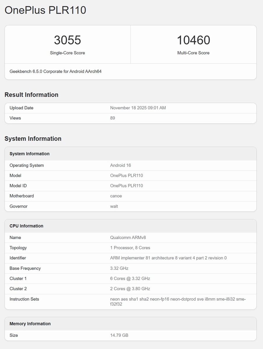 Der chinesische Leaker Digital Chat Station hat schon vor Wochen betont, dass der Non-Elite-Ableger in Sachen Performance kaum langsamer sein wird als der Snapdragon 8 Elite Gen 5, weswegen wir auch den Geekbench-Leak des Motorola Edge 70 Ultra vor einigen Tagen so ungewöhnlich fanden. Im Rückblick waren unsere Zweifel berechtigt, denn die aktuellen OnePlus Ace 6T Leaks auf Geekbench sprechen eine ganz andere Sprache. Hier zeigt sich der tatsächliche Snapdragon 8 Gen 5 von seiner besten Seite mit Single-Core-Werten bis zu 3.055 Punkten und Multi-Core-Scores bis 10.460 Punkten. Damit liegt der Flaggschiff-Killer tatsächlich recht nahe am Snapdragon 8 Elite Gen 5, der mit medianen Single-Core-Werten von 3.662 Punkten und medianen Multi-Core-Werten von 10.842 Punkten in unseren Tests nur im Single-Core-Segment spürbar besser abschneidet.