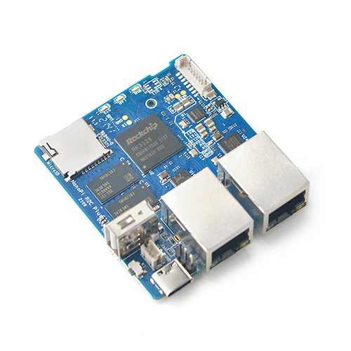 Der NanoPi R2C Plus ist ein Einplatinenrechner mit einem besonderen Fokus auf Netzwerk-Anwendungen. Das Modell ist mit gleich zwei Gigabit-Ethernet-Ports ausgestattet, einer der beiden Ethernet-Ports wird dabei intern durch das Abgreifen eines USB 3.0-Ports realisiert.