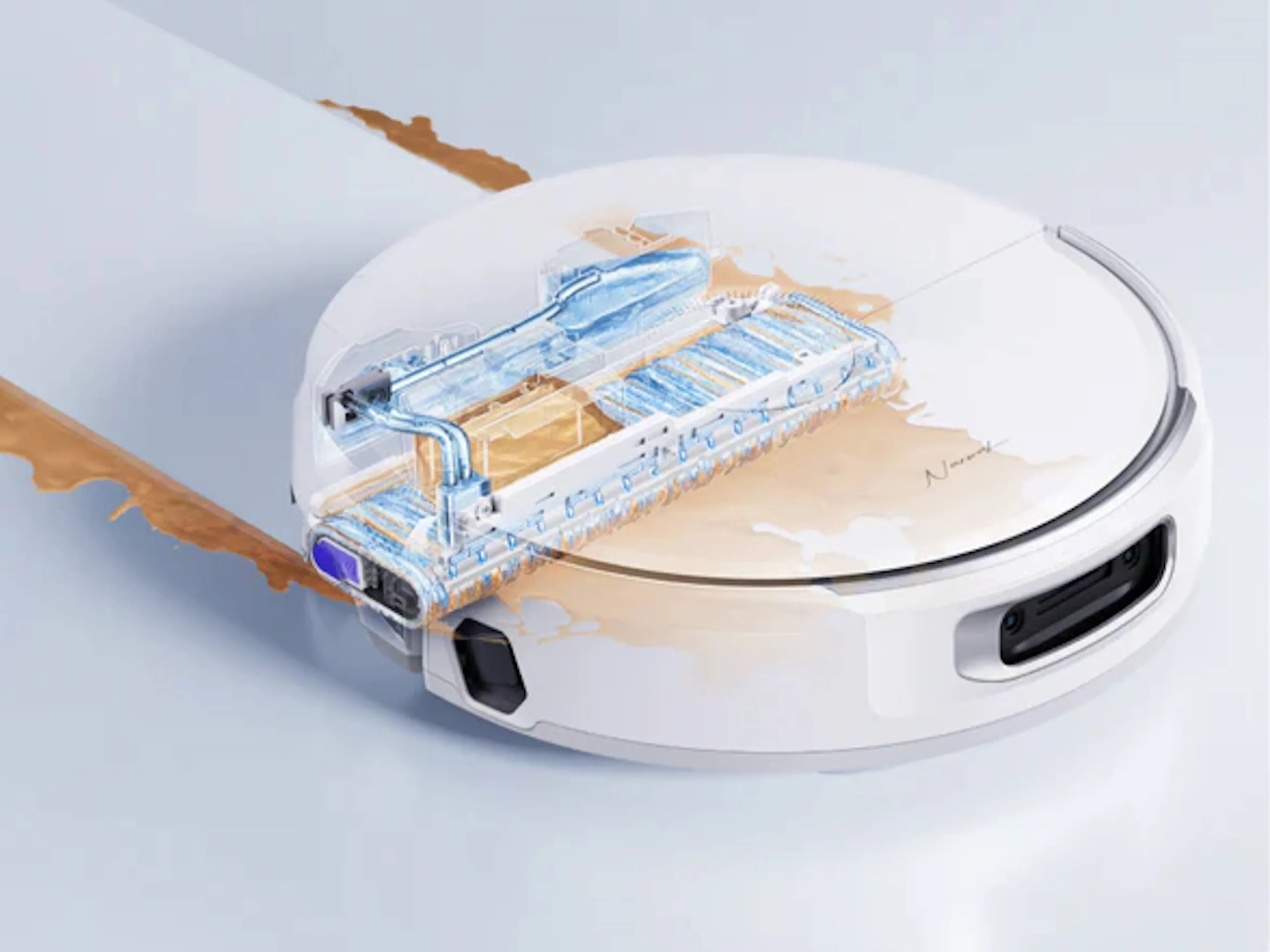 Der Narwal Flow ist ein neuer Saug- und Wischroboter, der mit einem speziellen System zur feuchten Reinigung kommt. Konkret erfolgt die Reinigung nicht mit rotierenden Wischmopps, sondern mit einer einzelnen Wischwalze, wobei diese allerdings nicht ganz rund ist - sondern etwas breiter, räumlich gesehen ließe sich die Rolle als Zylinder beschreiben. Diese Rolle wird dann während der Reinigung auch von Schmutzwasser befreit, Schmutz dürfte dementsprechend eher weniger verschleppt werden können, es wird warmes, frisches Wasser aufgesprüht. Die Rolle soll aufgrund der Positionierung auch etwa an Wandabschlussleisten eine gründliche Reinigung bieten - und damit nur ein minimaler Schmutzrand bleiben.