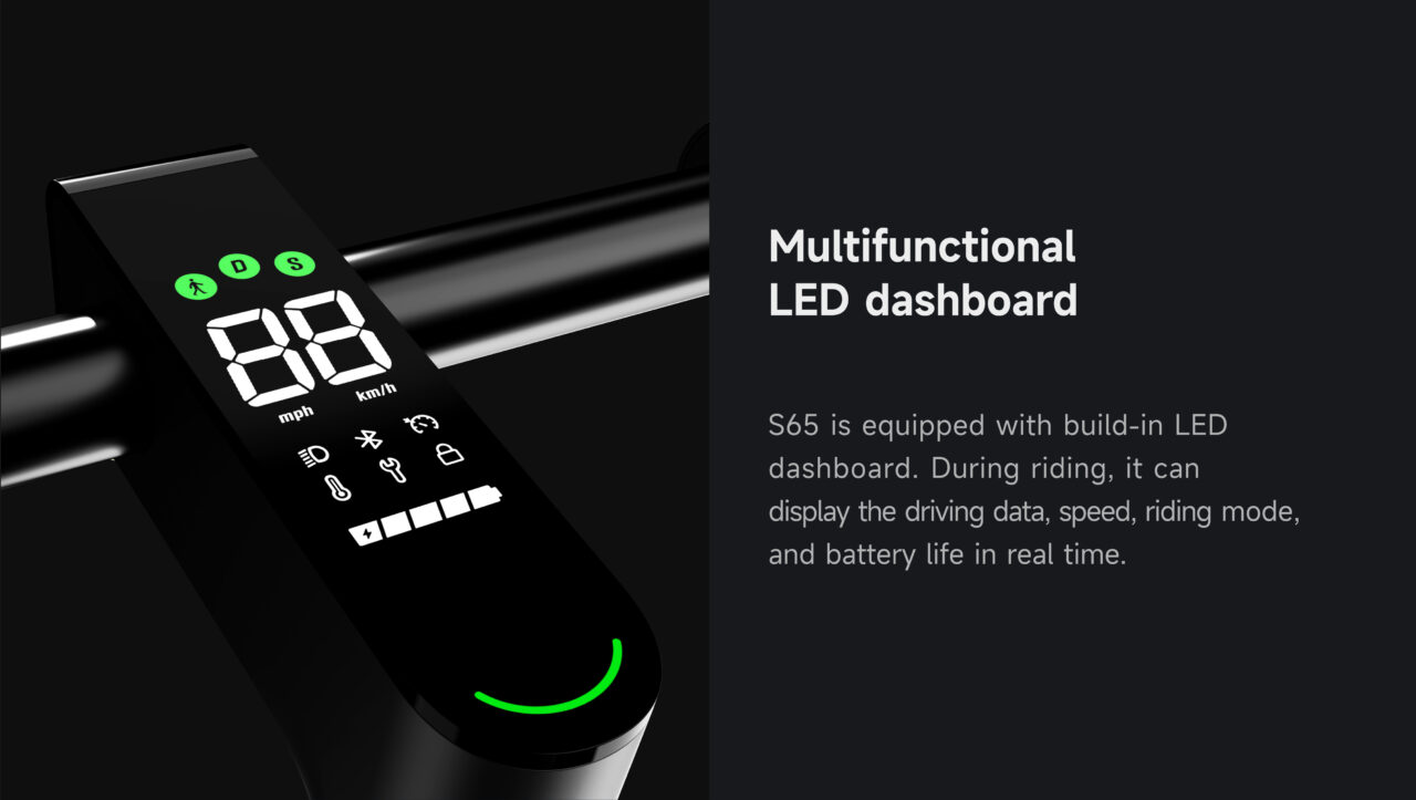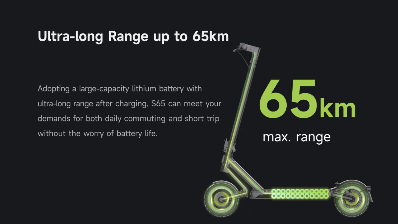Es sind 10 Zoll große, selbst abdichtende Reifen vorhanden, der Scheinwerfer bringt es auf eine Leistung von 2,5 Watt. Die maximale Belastbarkeit wird mit 120 Kilogramm angegeben, eine Scheibenbremse ist hinten verbaut. Die Nutzung einer App ist möglich, der S65 lässt sich falten. Vorne und hinten kommt eine Federung zum Einsatz, was einen erhöhten Fahrkomfort entspricht.