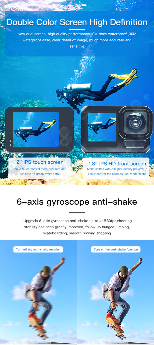 Erst 6K nimmt der GoPro-Klon mit akzeptablen 30 fps auf, bei 4K sind dann 60 fps möglich - da schaffen aber sowohl die GoPro als auch der kommende DJI Osmo Action-Nachfolger bereits 120 fps. Zaubern können die Chinesen also nicht, auch wenn hier immerhin bessere Bildqualität also mit einer Osmo Action aus 2019 versprochen wird, die wir aktuell allerdings auch schon zu Preisen unter 250 Euro finden. Ob die Sechs-Achsen "HyperSmooth" Stabilisierung auf dem Niveau der etablierten Anbieter ist, wissen wir nicht, immerhin bekommt man hier aber wie bei der GoPro Hero 10 Black ein bis zu 10 Meter wasserdichtes Gehäuse mit Display an der Front und Touchdisplay hinten.