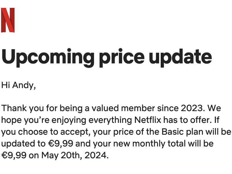 Netflix wird auch für die Bestandskundschaft des Basic-Abos teurer. Wie Netflix in einer E-Mail in der Nacht vom Freitag auf den Samstag verkündete, steigt der Preis ab dem 20. Mai 2024 von derzeit rund 8 Euro auf dann 10 Euro pro Monat.