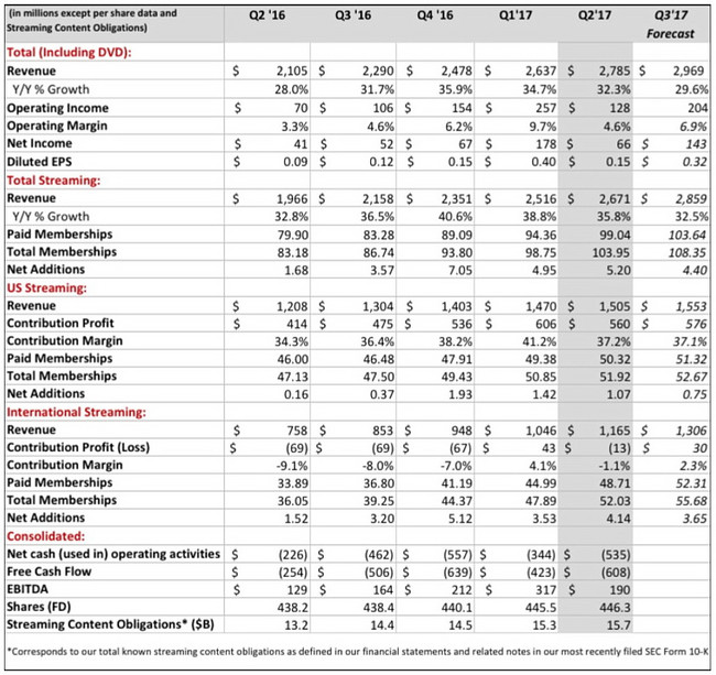 Allerdings drücken die Kosten für die weltweite Expansion auf die Bilanzzahlen. So stieg zwar der Umsatz von 2,637 Mrd. auf 2,785 Milliarden US-Dollar. Der operative Gewinn sank allerdings um 50,2 Prozent, von 257 Mio. auf 128 Millionen Dollar. Und auch der Nettogewinn schrumpfte gewaltig - um fast 63 Prozent : Konnte Netflix in Q1/2017 noch einen Gewinn von 178 Millionen US-Dollar ausweisen, so stehen im Geschäftsbericht Q2/2017 an dieser Stelle nur noch 66 Millionen Dollar.