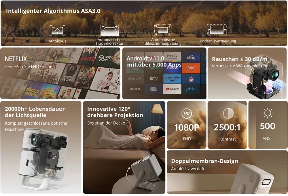 Bei der Ausrichtung der bis zu 140 Zoll großen Projektion helfen Hindernisvermeidung, Autofokus und Trapezkorrektur sowie Bildanpassung. Die native Auflösung des Wanbo T2 Ultra liegt bei Full HD / 1080p. Die Bildhelligkeit ist mit bis zu 500 ANSI Lumen angegeben. Durch die Verwendung einer versiegelten optischen Einheit wird eine klare Wiedergabe und eine extrem niedrige Lautstärke von maximal 30 dB/m gewährleistet.