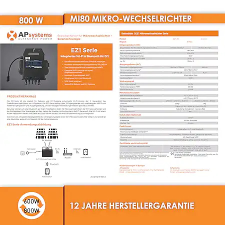 Der Lieferumfang umfasst zwei Photovoltaikmodule von Zhongyi New Energy mit je 415 Wp in Full Black sowie 12 Jahren Produkt- und 25 Jahren Leistungsgarantie. Darüber hinaus enthält das Komplettset einen Mikro-Wechselrichter AP Systems EZ1-M mit integriertem WiFi und einer Leistung von 800 W, welcher baugleich mit dem ANKER MI80 ist. Der Inverter ist mit lokaler API ausgestattet, um die Solarmoduldaten in Echtzeit auszulesen und kommt mit 12 Jahren Herstellergarantie.