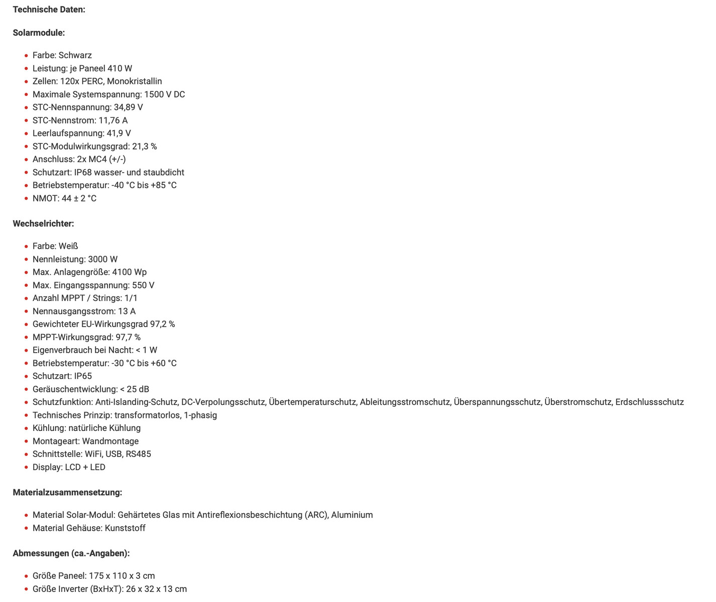 Schauen wir uns das Angebot einmal genauer an. Es werden acht schwarze Solarmodule von Risen des Modells RSM40-8-410M geliefert. Die Module kommen mit einer Leistung von jeweils 410 Wp, einem Wirkungsgrad von 21,3 % und Perc-Technologie. Die Abmessungen betragen 175 x 110 x 3 cm.