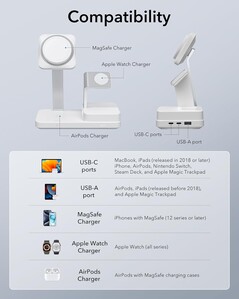 Der rechte Arm ist für eine Apple Watch (alle Generationen), auf der Bodenplatte können AirPods drahtlos geladen werden. Zudem weist die ESR 100W 6 in 1 GaN Ladestation mit CryoBoost an der rechten Seite drei USB-Ports auf, wobei zwei davon USB-C und einer USB-A nutzen. Hierüber lassen sich Notebooks, Smartphones, Tablets und mehr mit bis zu 100 W laden.