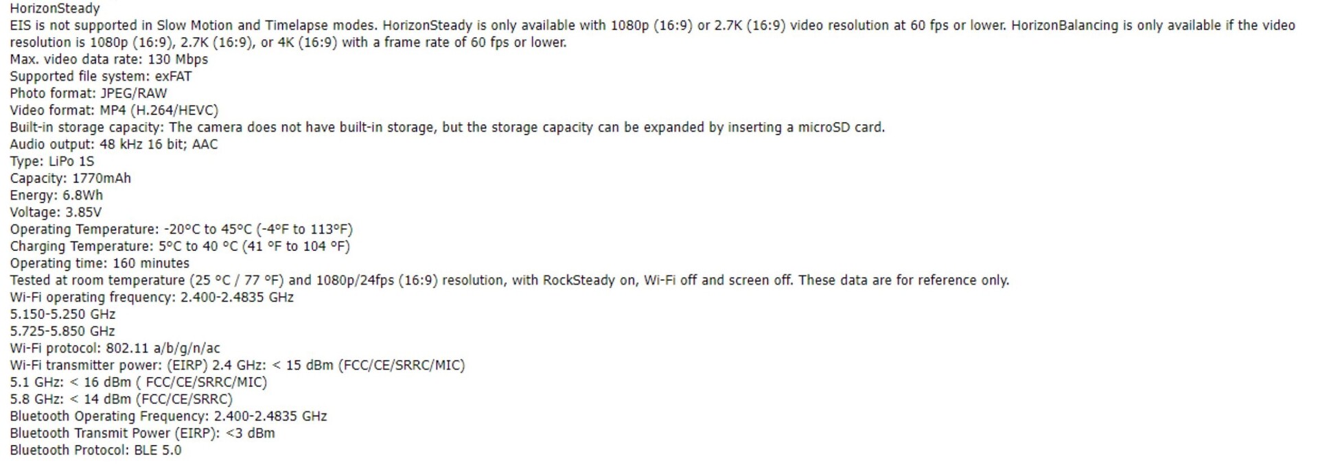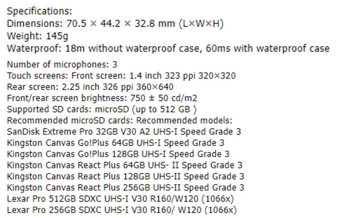 Auch das Datenblatt bestätigt, dass DJI an der Actioncam selbst sehr wenig ändert, die Specs ähneln einander stark. Teils sind sie auch minimal schlechter, etwa bei der Auflösung, die nun offenbar auf UHD (3840 Pixel) statt 4K (4096 Pixel) beschränkt wird, die Framerate bleibt mit maximal 60 fps im 4:3 Format oder 120 fps im 16:9 Format gleich. Nicht mal die Stabilisierung wurde upgedatet, es bleibt laut Leak bei Rock Steady 3.0 und RockSteady 3+, beide sind nach wie vor nicht bei 4K-Aufnahmen nutzbar. Der neue, größere Sensor (1/1.3 Zoll statt 1/1.7 Zoll) verspricht allerdings eine bessere Bildqualität vor allem bei Low-Light-Aufnahmen, zudem ist die Actioncam nun bis zu 18 Meter wasserdicht.