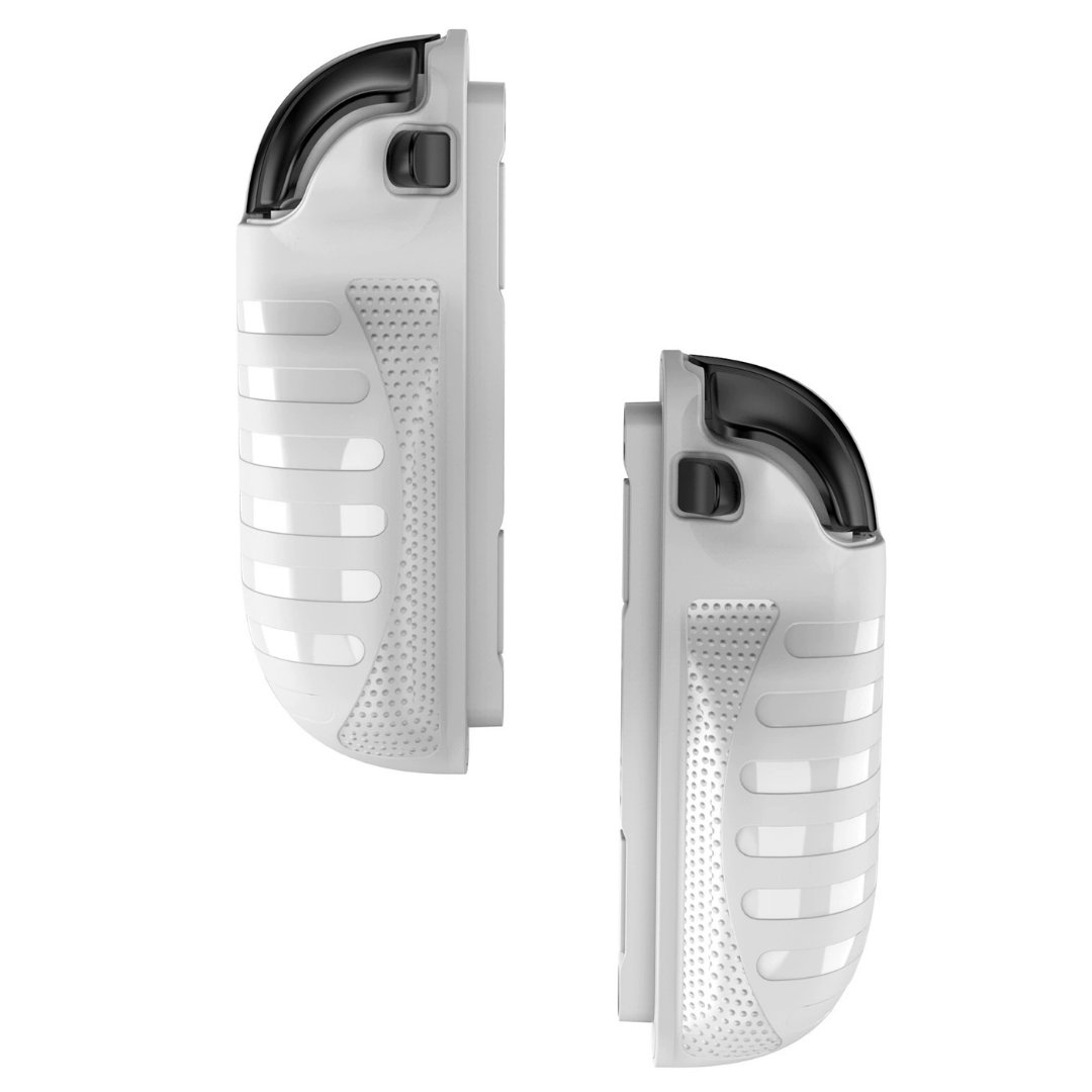 Die neuen Joy-Cons werden nun magnetisch an die Konsole gehaftet und verfügen zusätzlich über rückseitig angebrachte Release-Buttons. Den bisher durchgesickerten Bildern zufolge hat Nintendo die Batterieanzeigen so platziert, dass der Batterie- und Spielerstatus auch angezeigt wird, wenn die Joy-Cons in Zubehör wie einem Rennlenkrad oder einem ergonomischen Controller verwendet werden.
