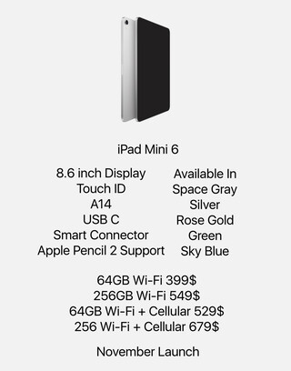 Das Tablet soll erst im November auf den Markt kommen – falls das stimmt ist eine Vorstellung zum morgigen "California Streaming"-Event nicht besonders wahrscheinlich. Das iPad mini der sechsten Generation soll genau wie das aktuelle Modell wahlweise mit 64 GB oder mit 256 GB Speicher erhältlich sein, und auch die Preise sollen sich nicht ändern.