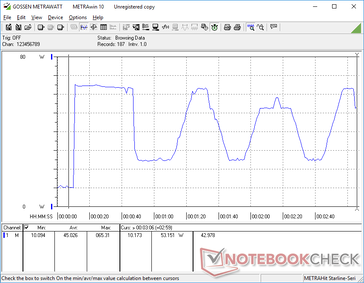 Unter geringen Lasten bleibt der Verbrauch im Vergleich zum Vorjahr, trotz der effizienteren Core-U-CPU, konstant. Bei anspruchsvolleren Lasten wie Gaming oder Prime95 pendelt der Verbrauch, wie im Graph angezeigt, während der Verbrauch im ThinkPad X1 Yoga G7 deutlich stabiler war. Das Pendelverhalten im Verbrauch spiegelt unsere Messwerte für Taktraten und Leistungsaufnahme im Abschnitt Stresstest weiter oben wider.