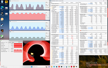 Beim Starten von Prime95 bosstet die CPU für nur etwa eine Sekunde auf 4 GHz und 53 W hoch, dann erreichen die Kerne eine Temperatur von 100 °C. Anschließend beginnen Taktraten, Leistungsaufnahme und Kerntemperaturen zu pendeln, und zwar zwischen 1,4 und 3,5 GHz, 13 bis 44 W und 74 bis 100 °C. Dieses Verhalten unterscheidet sich von den meisten anderen Core-U-Laptops, diese haben deutlich stabilere Taktraten und Temperaturen.