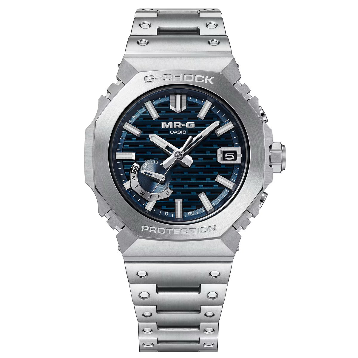 Das MR-G-Modell ist funkgesteuert (Multi-Band 6) und bietet Bluetooth-Konnektivität für Smartphone Link sowie eine automatische Zeigerkorrektur. Auf dem analogen Zifferblatt werden Stunden, Minuten und Sekunden angezeigt, ergänzt durch Datum und Wochentag. Zusätzliche Funktionen umfassen einen Modus zur Energieeinsparung sowie eine Hintergrundbeleuchtung mit einer LED in der Farbe Weiß.