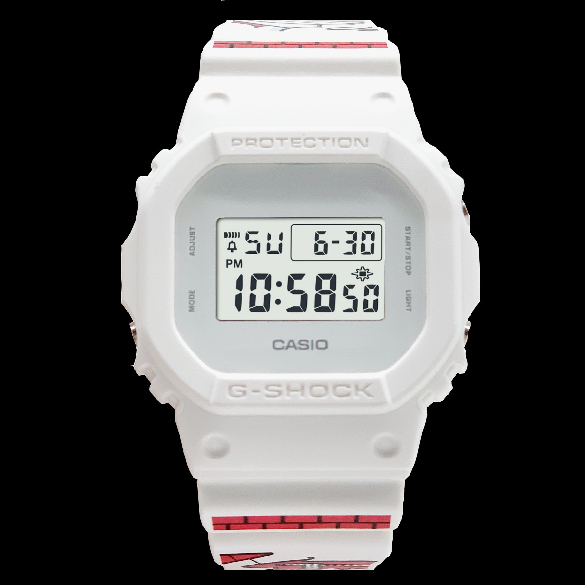 Wie bereits vermutet, basiert die Uhr auf dem klassischen DW-5600-Modell und trägt Hasers markantes Graffiti-Design: ein komplett weißes Gehäuse kombiniert mit einem Armband, das mit auffälligen roten und schwarzen Grafikelementen bedruckt ist. Ein besonderes Highlight ist die Verpackung – eine rote Displaybox mit Glasfront im „Notfallkoffer“-Stil, versehen mit dem Schriftzug „In Case of Emergency – Break Glass“. Sie wirkt eher wie ein Street-Art-Sammlerstück als wie herkömmliche Retail-Verpackung.