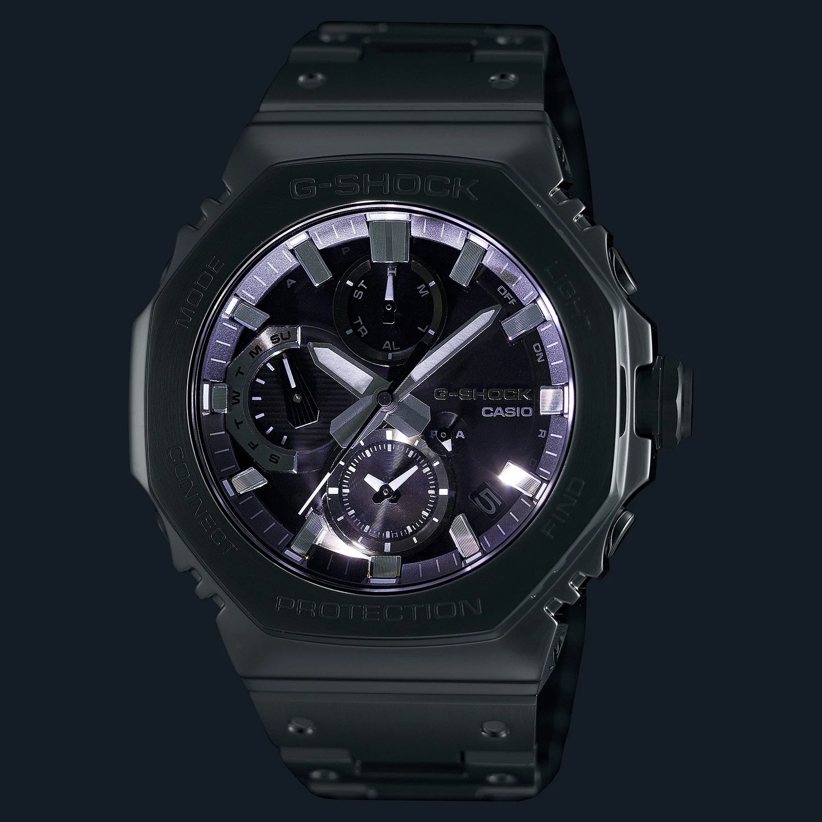 Die Uhr misst 51,3 x 46,3 x 12,4 mm und wiegt 171 Gramm, womit sie im Vergleich zu B2100-Modellen aus Resin zu den schwereren Varianten zählt. Die stoßfeste G-Shock-Konstruktion bleibt erhalten. Zusätzlich gibt es eine interne Dämpfung, um Stöße trotz des Vollmetall-Gehäuses abzufangen. Die Wasserdichtigkeit ist mit 20 bar angegeben.