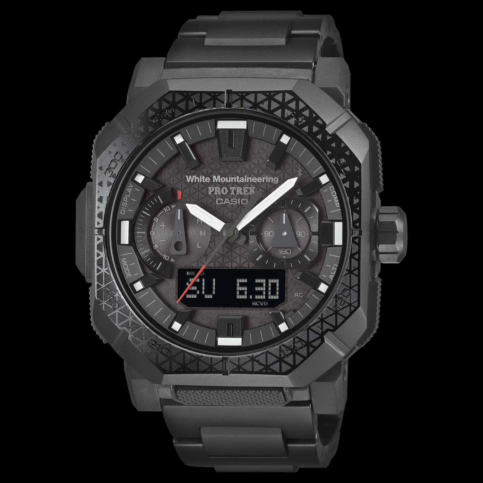 Für Februar 2026 haben Casio und das japanische Modelabel White Mountaineering die Markteinführung ihrer zweiten gemeinsamen Uhr, der hochwertigen Pro Trek PRW-B1000WM-1, offiziell bestätigt. Im Gegensatz zu einigen früheren Modellen aus Kunststoff basiert diese Version auf dem relativ neuen PRW-B1000-Chassis und ist mit einem robusten Titanarmband sowie fortschrittlichen Sensoren ausgestattet. Das Modell kostet rund 140.800 Yen (~ 770 Euro) und besticht durch ein mattes schwarzes Utility-Design, bei dem das charakteristische Dreiecksmuster von White Mountaineering in die ionisierte Edelstahl-Lünette eingraviert ist.