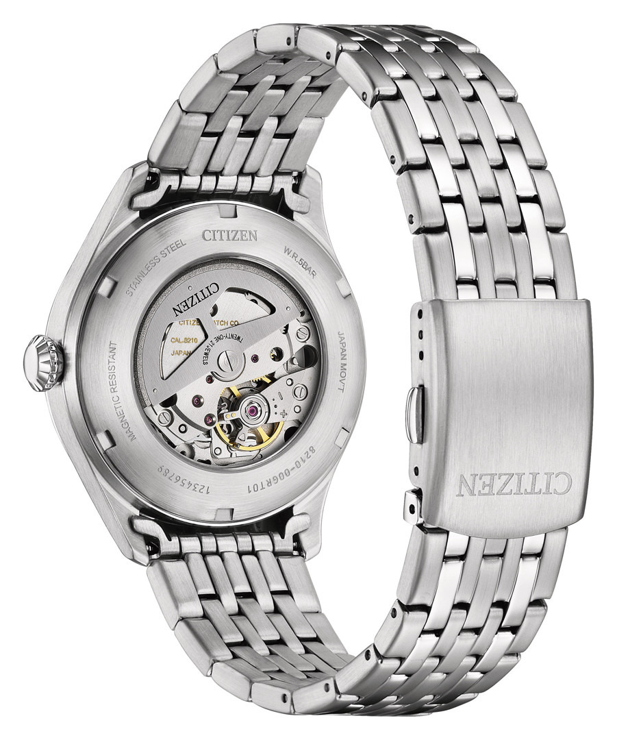 Die NJ0240-55L arbeitet mit dem Automatikkaliber 8210. Dabei handelt es sich um ein weitverbreitetes hauseigenes mechanisches Werk von Citizen, das mit 21.600 Halbschwingungen pro Stunde arbeitet und eine angegebene Gangreserve von rund 40 Stunden bietet. Das Gehäuse misst 40mm im Durchmesser und 11,6 mm in der Höhe und bleibt damit im üblichen Rahmen für eine Uhr zum täglichen Tragen. Sowohl Gehäuse als auch Armband bestehen aus Edelstahl, auf der Vorderseite sitzt ein Mineralglas. Die Uhr bietet zudem eine grundlegende Wasserdichtigkeit bis 50 m. Zu den weiteren funktionalen Merkmalen gehört eine Datumsanzeige.
