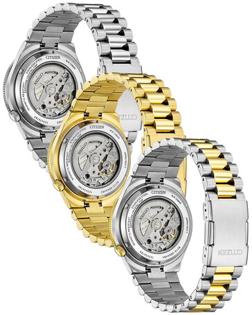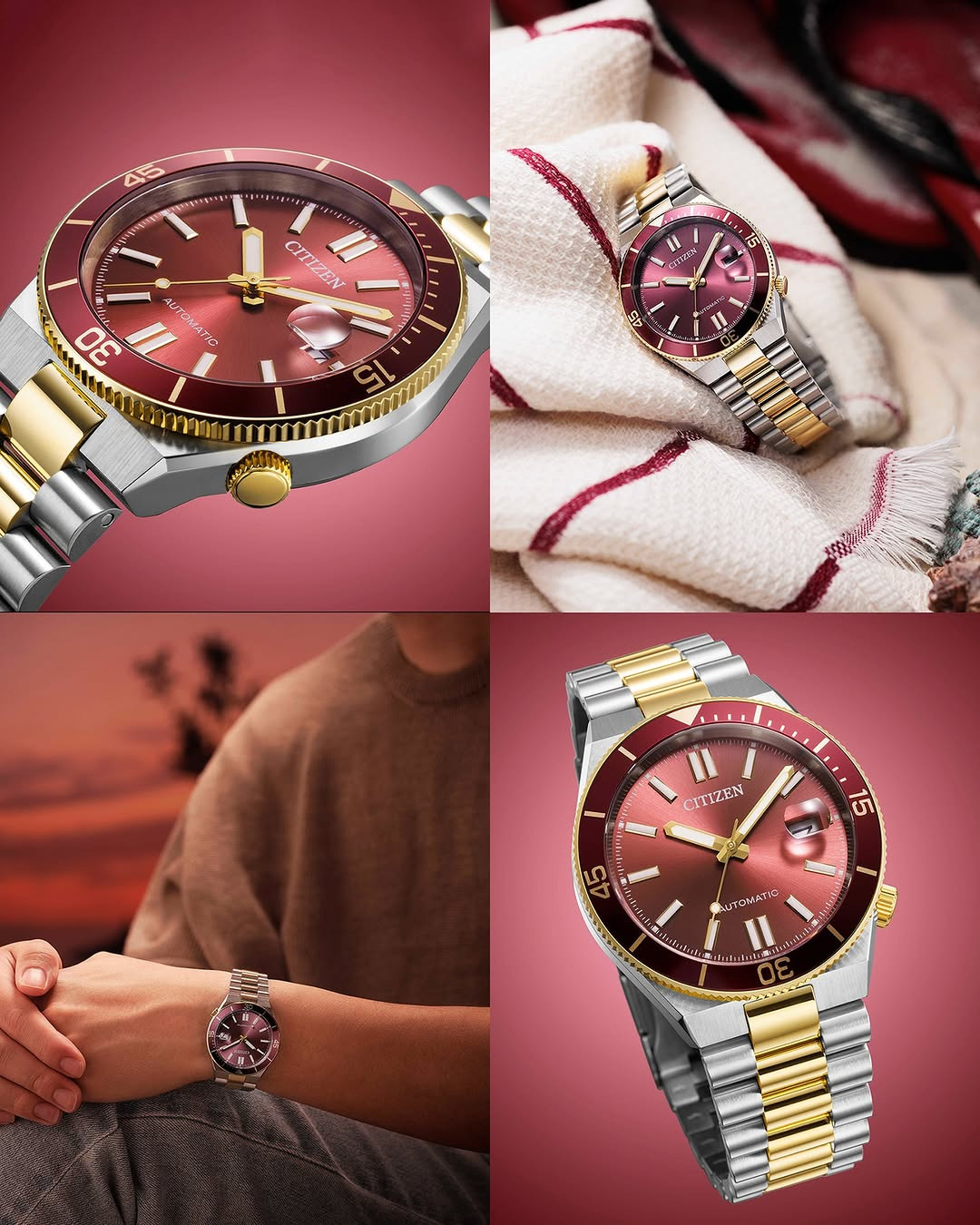 Mit der neuen Reihe entfernt sich die Kollektion etwas vom bislang klar sportlich-eleganten Auftritt und schlägt eine funktionalere, stärker auf Alltagstauglichkeit ausgelegte Richtung ein. Man könnte von einer dezenten „Desk-Diver“-Anmutung sprechen. Ein häufiger Kritikpunkt an der bisherigen NJ015-Serie war das Fehlen einer praktisch nutzbaren Lünette. Diesem Punkt begegnet Citizen nun mit einer einseitig drehbaren Lünette. Allerdings wächst dadurch die Gehäusehöhe auf 12,5 mm, während frühere Versionen mit 11,7 mm etwas flacher ausfielen. Zum Start erscheinen vier Varianten: die navyfarbene NJ0230-59L, die blaugrüne NJ0231-56L, die goldfarbene NJ0232-53X mit grünem Zifferblatt sowie die zweifarbige NJ0234-58X mit rotem Zifferblatt.
