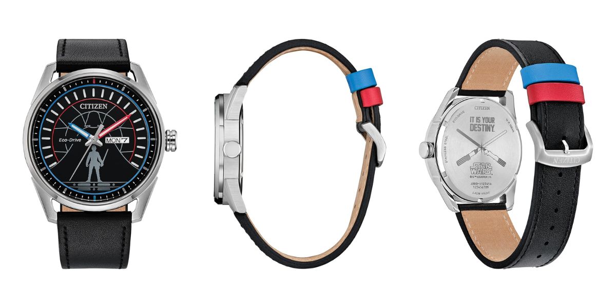 Ausgestattet mit einem schwarzen Zifferblatt zeigt die Citizen Star Wars Duel-Uhr silberfarbene Umrisse von Luke Skywalker und Darth Vader, die sich in Cloud City zu ihrem legendären Duell aus „Das Imperium schlägt zurück“ gegenüberstanden. Rote und blaue Akzente ziehen sich durch das Design, darunter die mit Leuchtmasse gefüllten Zeiger und die Schlaufen des Armbands – die Farben der im Kampf verwendeten Lichtschwerter. Das Zifferblatt ist von einem Gehäuse aus gebürstetem Edelstahl mit 42 mm Durchmesser umgeben; auf dem Gehäuseboden sind der Schriftzug „It is your destiny“ und zwei Lichtschwerter eingraviert.