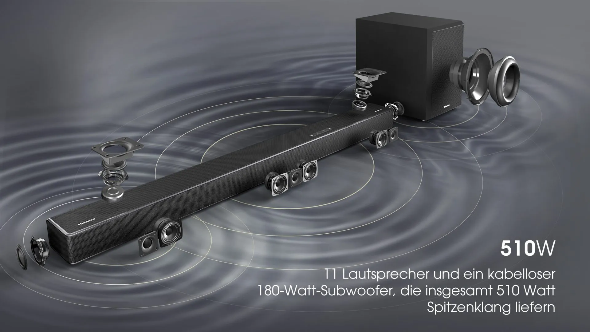 Die Hisense U5120GW Soundbar kommt mit einem kabellos angebundenen Subwoofer daher und ist ein 5.1.2 Sound System. Insgesamt elf Lautsprecher (achtmal Full Range, dreimal Tweeter) stecken in der Soundbar, wovon sieben Stück nach vorne, zwei nach oben sowie je einer nach links und rechts abstrahlen. Sie bringen es zusammen auf 330 Watt, der Subwoofer auf 180 Watt. So ergeben sich eine Gesamtleistung von 510 Watt und eine maximale Audio-Leistung von 101,0 dB SPL. Optional kann die Soundbar um zwei Rear-Speaker ergänzt werden.