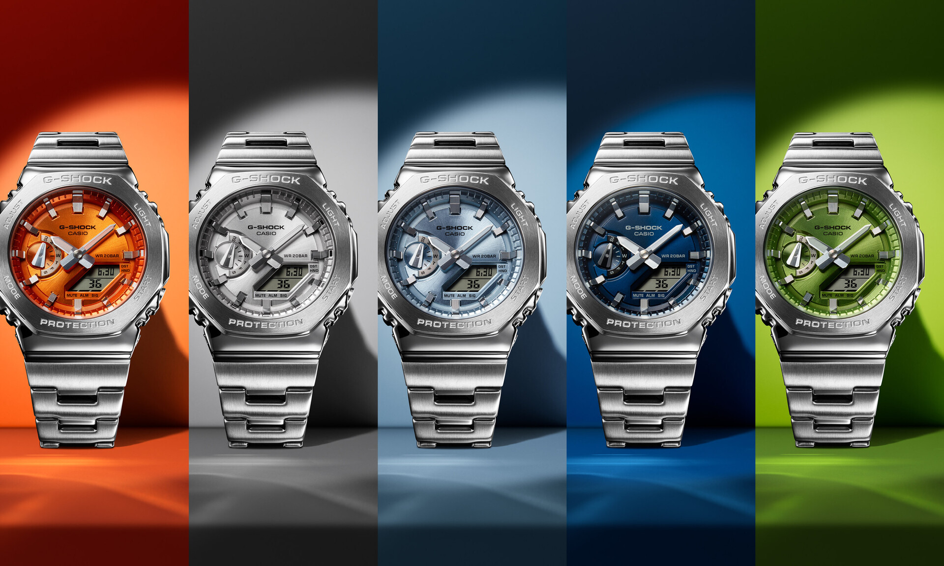Hinsichtlich der Funktionen ist die hierzulande noch nicht bei Casio Deutschland gelistete GM2110D-Serie, die für jeweils 300 US-Dollar aus den Modellen GM2110D-2A, GM2110D-2B, GM2110D-3A, GM2110D-4A und GM2110D-7A besteht, weitestgehend gleich. Allerdings präsentiert sich diese neue G-Steel-Reihe von Casio G-Shock mit einer Edelstahllünette im achteckigen Design sowie einem Armband aus gleichem Material. Unterschiedlich fällt bei den einzelnen Modellen die Farbe des Zifferblattes aus, das auch hier analoge Zeiger und digitales Display kombiniert.
