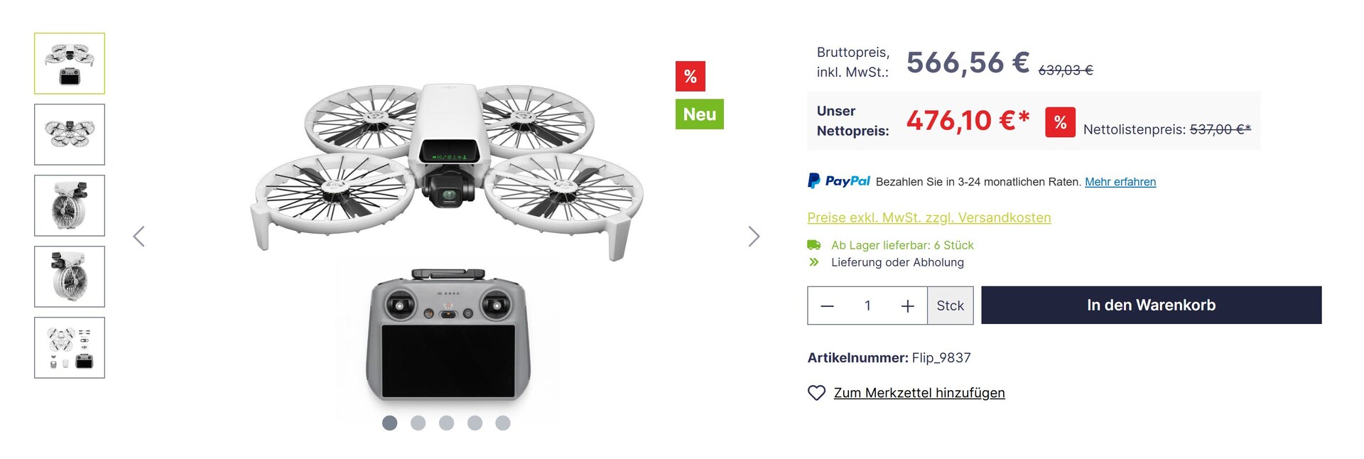 Privatpersonen können wohl aber auch bestellen, verzichten dann allerdings auf das Widerrufsrecht, nicht aber auf die Garantie und Gewährleistung. Das deutsche Widerrufsrecht garantiert Privatpersonen bei Verträgen oder Käufen 14 Tage lang einen Rücktritt vom Vertrag. Man sollte sich also wirklich sicher sein, dass man die DJI Flip auch tatsächlich haben will und/oder gebrauchen kann, einfach grundlos zurückschicken lässt sie sich in diesem speziellen Fall nämlich nicht.