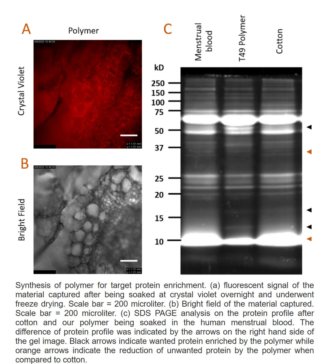 Durch die Entwicklung eines speziellen Polymers ist es gelungen, ein Material zu schaffen, das gezielt bestimmte Proteine aus dem Menstruationsblut bindet. Dieses Polymer weist eine poröse Struktur auf, die wie ein molekularer Schwamm fungiert. Wenn die Menstruationsflüssigkeit mit dem Polymer in Kontakt kommt, werden die gewünschten Proteine selektiv in den Poren des Materials festgehalten. Diese angereicherten Proteine können anschließend mithilfe gängiger biochemischer Methoden analysiert werden, um auf mögliche Erkrankungen hinzuweisen.