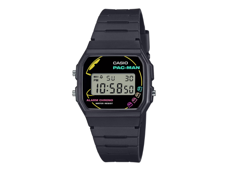 A168WEPC-7A bietet ein ähnliches Retro-Design, kommt jedoch in hellem Silber mit farbenfrohen Pac-Man-Elementen. Sie enthält Basisfunktionen wie eine 1/100-Sekunden-Stoppuhr, einen täglichen Alarm und stündliche Zeitsignale. Die Elektrolumineszenz-Hintergrundbeleuchtung (EL) sorgt für einfache Lesbarkeit, während die Batterie bis zu sieben Jahre hält.