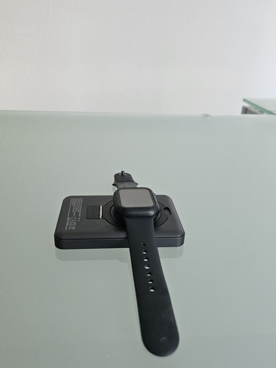 Die Rückseite präsentiert sich hingegen in einem mattgrauen Aluminium und hält die zweite Auffälligkeit parat. Hier gibt es einen Anschluss zum drahtlosen Laden von Smartwatches. Genau genommen lässt sich hierüber eine Apple Watch kontaktlos laden, sodass die smarte Armbanduhr von Apple jederzeit und überall geladen werden kann.