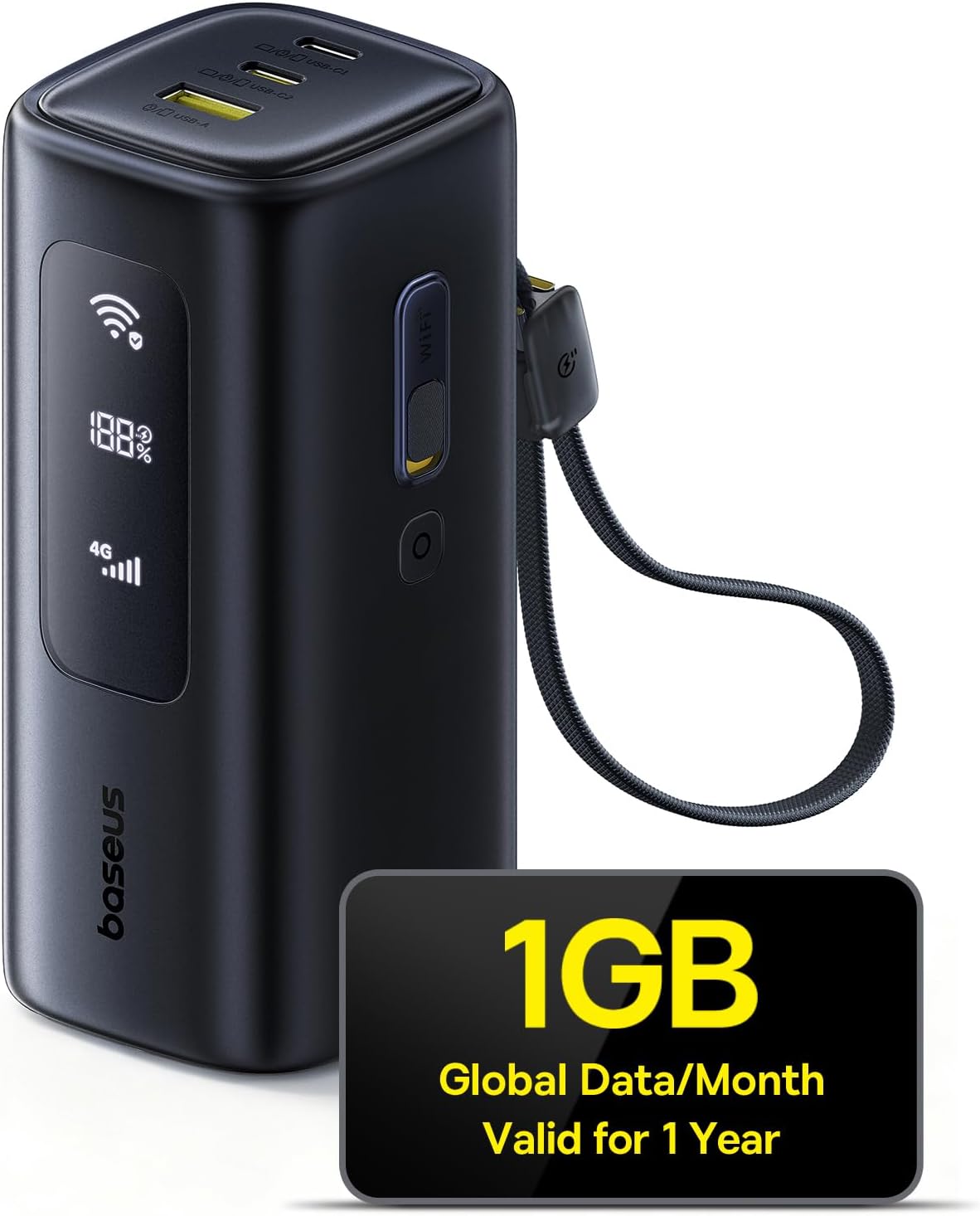 Hierfür verbindet sich die Baseus EnerGeek GX11 4G MiFi Power Bank bei Bedarf via 4G / LTE mit dem Handynetz. Eine SIM-Karte ist hierfür nicht erforderlich, auch eSIMs werden nicht unterstützt. Stattdessen muss einer der vom Hersteller in der Baseus MiFi App angebotenen Datentarife gebucht werden. Diese starten ab 4 US-Dollar (umgerechnet ca. 3,50 Euro) und sind in über 150 Regionen nutzbar. Das Gerät spannt dann als 4G-Hotspot sein eigenes WLAN-Netzwerk auf, mit dem sich bis zu 10 Geräte verbinden können. Die 4G-Datenrate beträgt maximal 150 Mbit/ im Download und 50 Mbit/s im Upload.