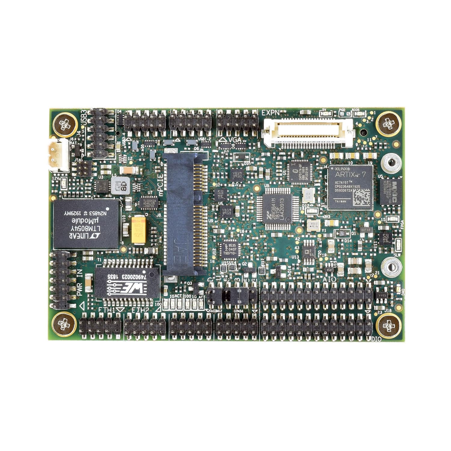 Das 55 × 84 × 47 Millimeter große System sieht aus dem Blick des Endanwenders und in Bezug auf die Anschlüsse recht nackt aus - und ist es im Prinzip auch. So müssen beispielsweise USB 2.0 und USB 3.0 über Header abgegriffen werden. Selbiges gilt für bis zu vier RS232/422/485-Anschlüsse. Eine Kamera kann über MIPI-CSI angebunden werden. Der Anschluss eines Displays ist über VGA und LVDS möglich. Ethernet kann ebenfalls nachgerüstet werden, und zwar zweimal mit bis zu Gigabit-Geschwindigkeit.