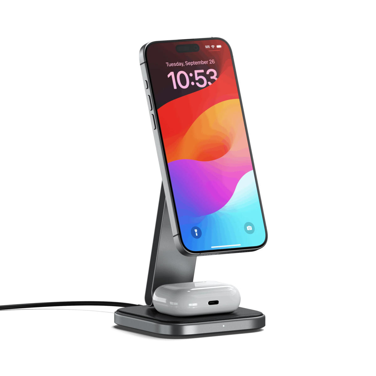 Wie der Name bereits verrät, ist der Satechi 2-in-1 Foldable Qi2 Wireless Charging Stand für das drahtlose Qi2-Laden von bis zu zwei Geräten ausgelegt. Zum einen bietet der Ladeständer eine magnetische Halterung für ein kompatibles iPhone (ab iPhone 12), über die eine Ladung mit bis zu 15 W im Hoch- oder Querformat erfolgt. Dazu können auf der darunter liegenden Ladefläche AirPods mit maximal 5 W geladen werden. Die Qi2-Ladestation wird via USB-C mit Strom versorgt, wobei ein entsprechendes Netzteil nicht im Lieferumfang enthalten ist.