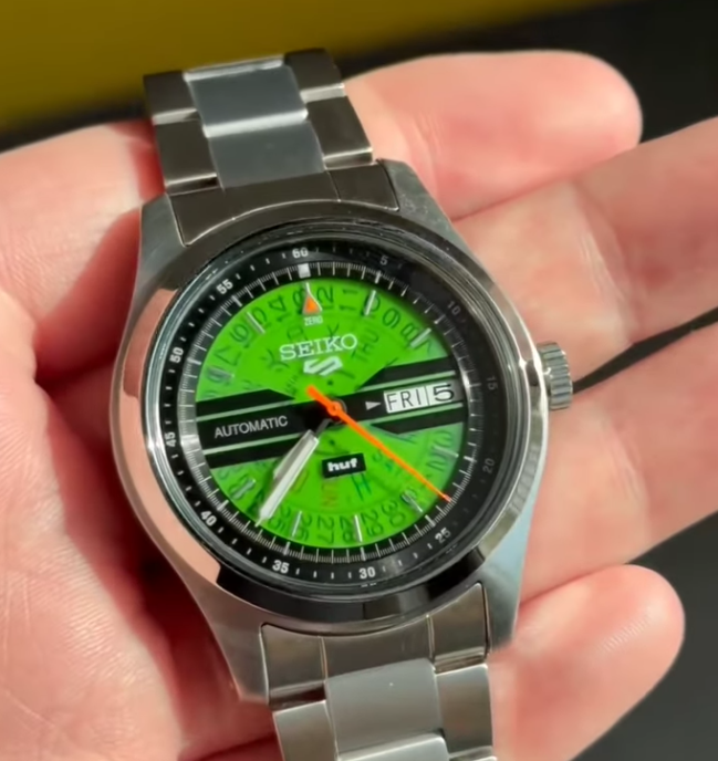 Die Seiko 5 Sports SRPM09 HUF Limited Edition, die Anfang Februar auf den Markt kam, ist nun in ersten Hands-on-Aufnahmen zu sehen. Sie zeigen das vom „Time Sonar“ inspirierte, lichtdurchlässige, grüne Zifferblatt in voller Pracht. Die neuen Bilder von @SeikoLeaks (YouTube) geben einen praktischen Einblick, wie das azetatgrüne Zifferblatt mit dem Licht interagiert. Die hohe Transparenz legt die darunterliegenden mechanischen Tag- und Datumsscheiben frei. Dieser Look, der vom 70er-Jahre-Klassiker „Time Sonar“ inspiriert ist, erzeugt einen seltenen dreidimensionalen Effekt in der Einsteigerklasse der Seiko 5. Während Renderings diese Texturen oft glätten, zeigen die echten Fotos einen industriellen Charakter: Der schwarze „Automatic“-Balken und das „huf“-Logo bei 6 Uhr scheinen förmlich über der grünen Scheibe zu schweben.