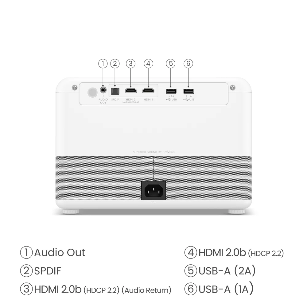 Dank 1,3-fachem Zoom wirft der Projektor ein 100 Zoll großes Bild aus rund 2,2 bis 2,9 m Entfernung auf die Projektionsfläche, für 150 Zoll sind es 3,3 bis 4,3 m. Für die Bildkorrektur stehen neben einem Autofokus auch eine Anpassung der Projektionsgröße, automatische 2D-Keystone-Korrektur und Hindernisvermeidung zur Verfügung. Auch das integrierte Soundsystem mit vier Lautsprechern sorgt dafür, dass der Projektor besonders flexibel aufgestellt werden kann. Denn der 360-Grad-Sound passt die Wiedergabe auf die jeweilige Sitzposition an. Zuspieler lassen sich via zweimal HDMI 2.0b und zweimal USB-A an den BenQ GP500 anschließen.
