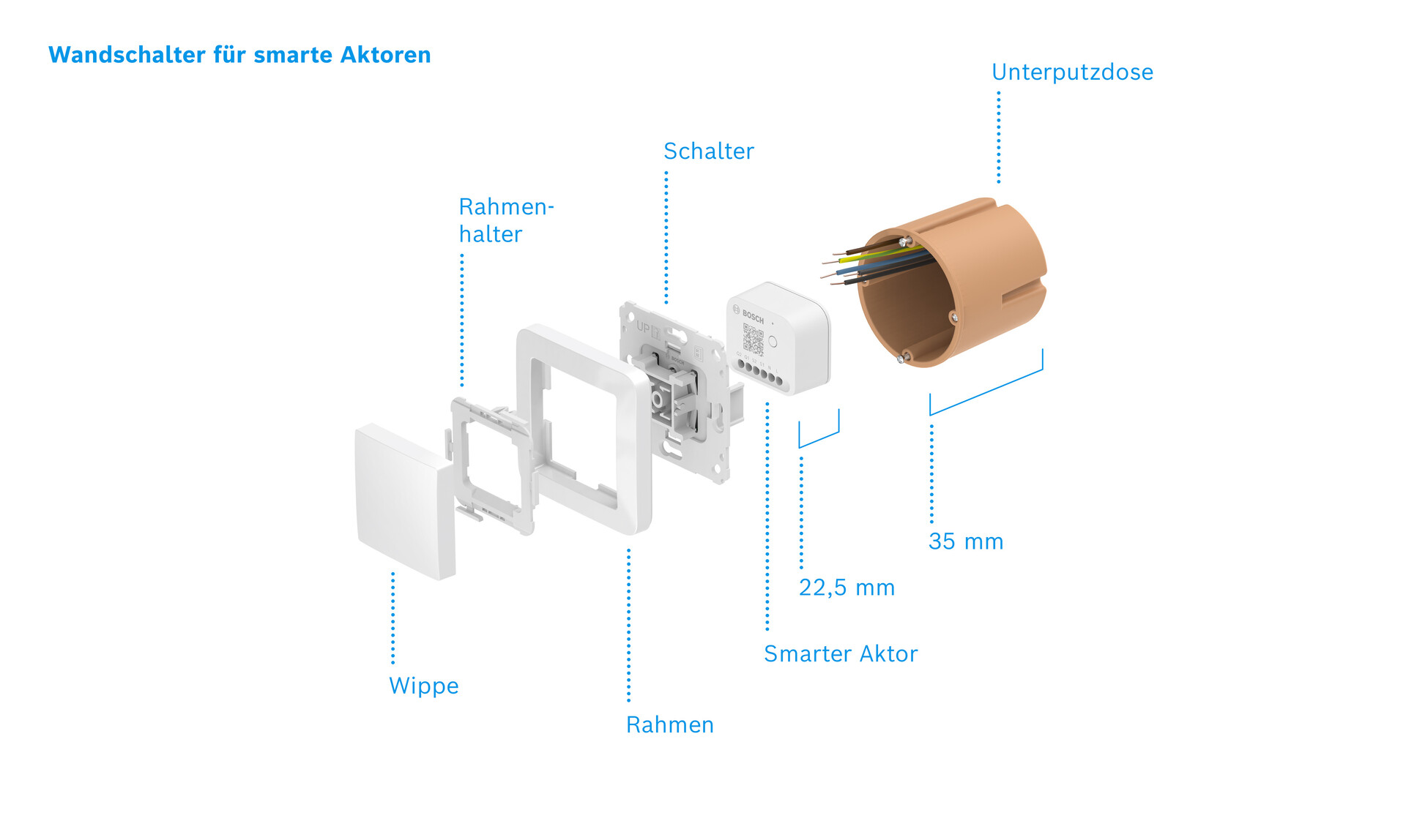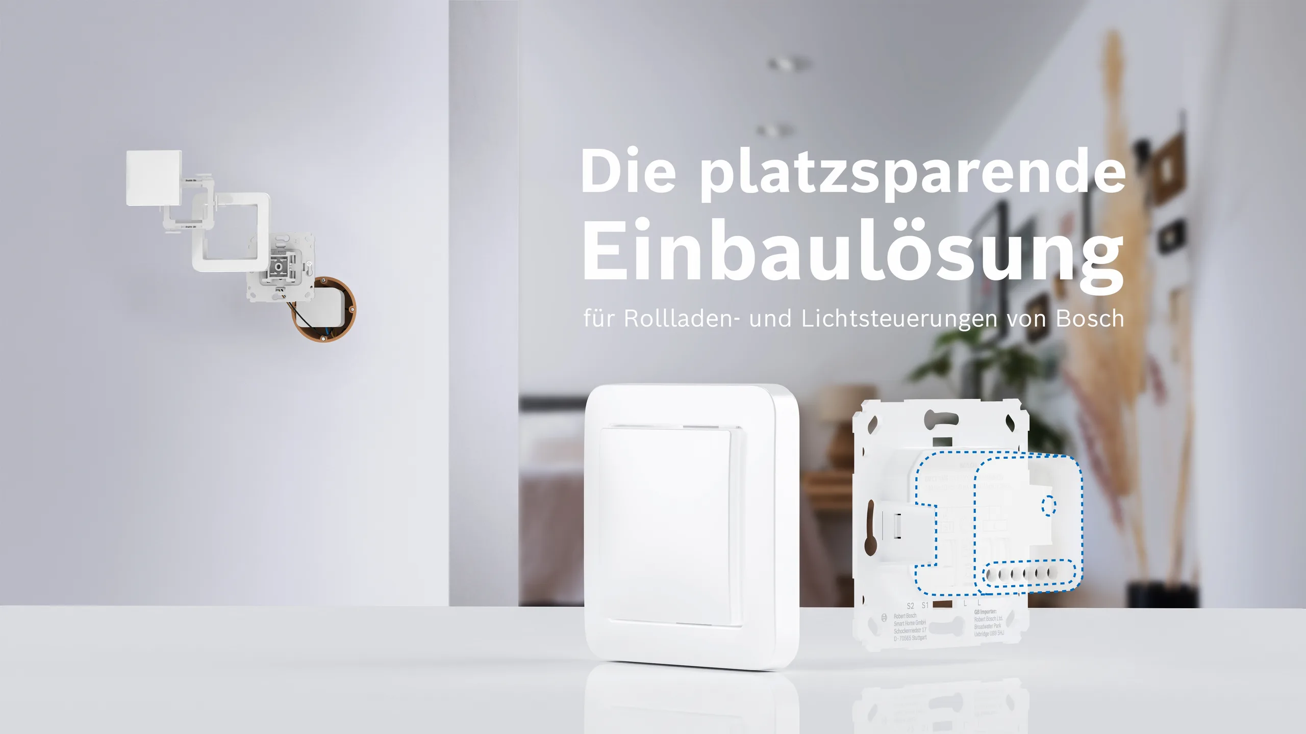 Der Bosch Smart Home Wandschalter ermöglicht den platzsparenden Einbau der Licht-/Rollladensteuerung II, des Relais und des Dimmer von Bosch Smart Home in vorhandene Gerätedosen. Nutzbar ist er ab 35 mm Einbautiefe. Der Wandschalter für smarte Aktoren besteht aus Schalter, Rahmen (80 x 80 mm), Rahmenhalter und Wippe (55 x 55 mm) und ist kompatibel mit fast jeder Unterputzdose. Das neue Produkt kann als Komplettlösung bestehende Schalter ersetzen oder in bereits vorhandene, kompatible Schalterserien integriert werden. So ist auch eine unsichtbare Installation hinter bereits bestehenden Wandtastern möglich.