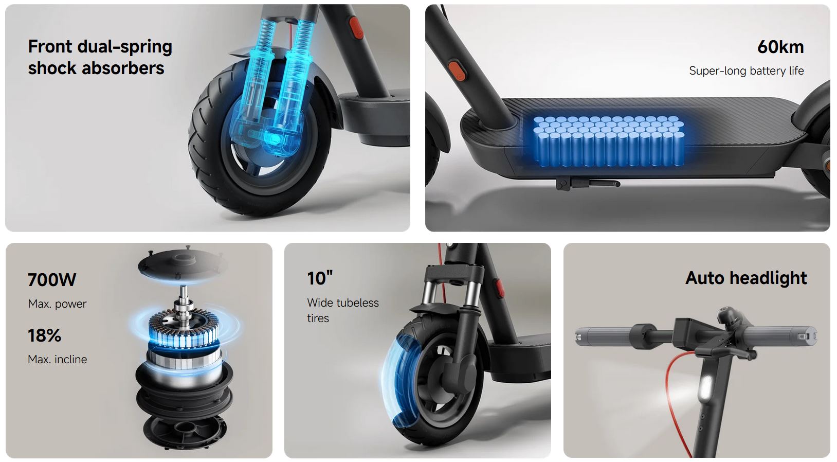 Angetrieben wird der Xiaomi Electric Scooter 5 von einem bis zu 700 W starken Motor, der den E-Scooter Steigungen von bis zu 18 Prozent erklimmen lässt. Unter dem Trittbrett sitzt eine 477 Wh große Batterie, mit der Fahrten von bis zu 60 km Länge mit einer Akkuladung möglich sein sollen. Das wäre deutlich mehr als beim Vorgänger. Ein Batterie-Management-System (BMS) schützt den Akku.